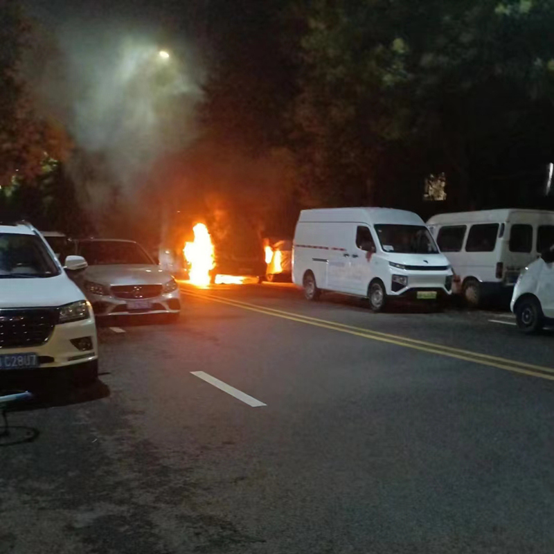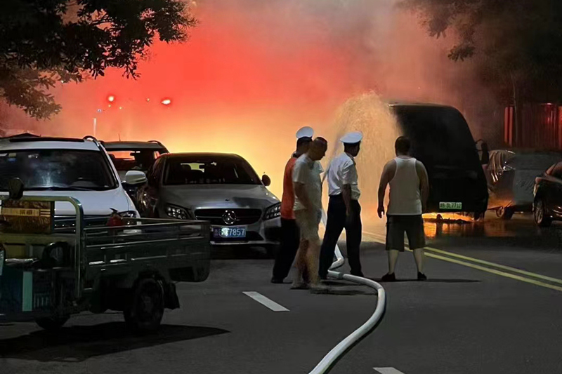 7月16日晚22點(diǎn)左右,鑫江玫瑰園二期秩序巡邏崗?fù)踅蛋鄷r(shí)發(fā)現(xiàn),園區(qū)外市政道路上停放的一輛大型新能源車突然起火且火勢(shì)較大,王建濤立即按照平日消防演練的標(biāo)準(zhǔn)流程,上報(bào)火情、組織滅火,同時(shí)撥打119和110。